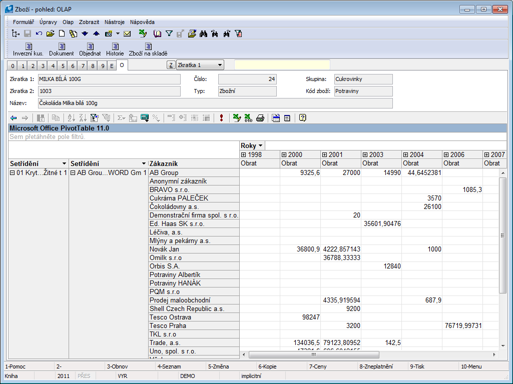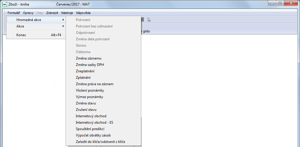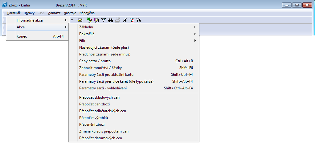 From the point of monitoring stock records, setting the requested stock and the current period is essential. The display of stock information is tied to this. These data are also essential for the printing of stock reports. The set period and stock are displayed in the upper blue bar on the screen. Changing the period and stock may be done by pressing the Alt+F10 key.