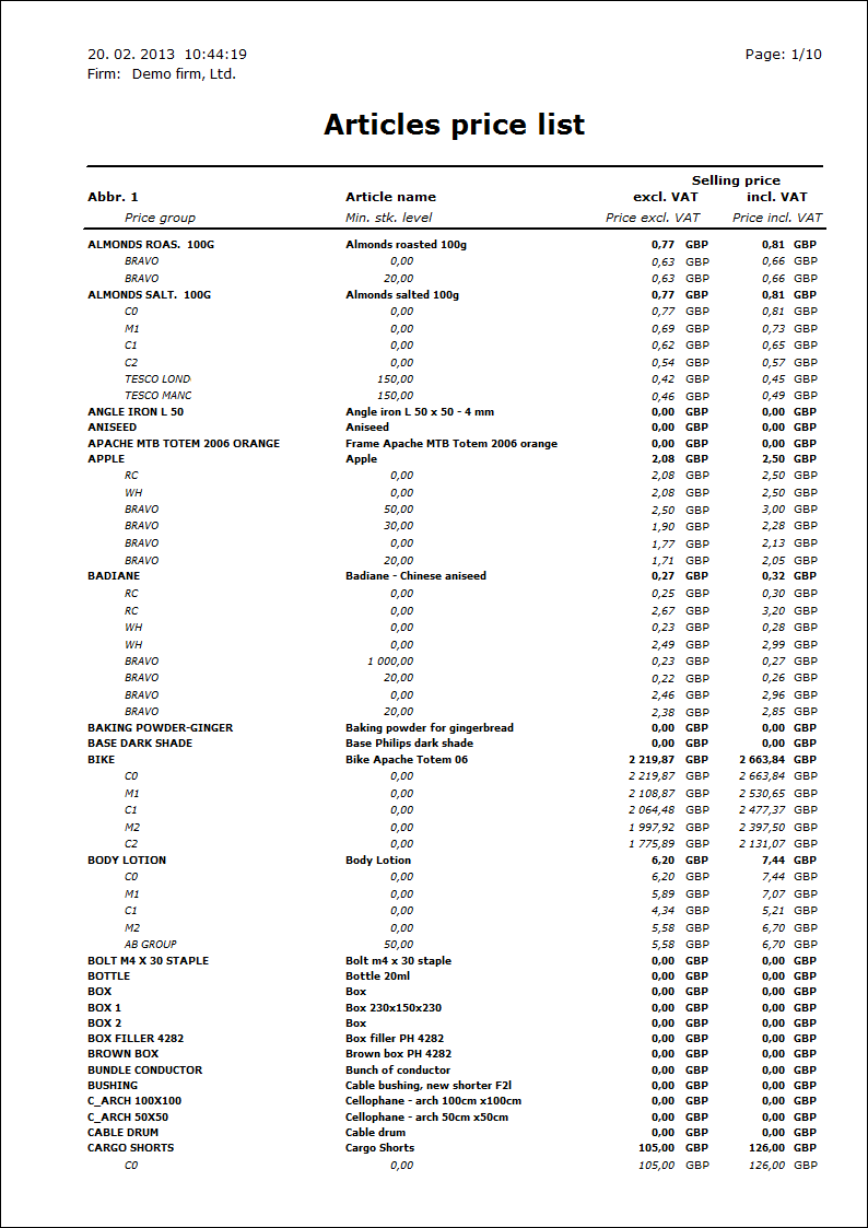 ShowZeroItem - No Yes - article with zero turnover will display. Note: Cards with zero turnover and zero initial state are never printed. |