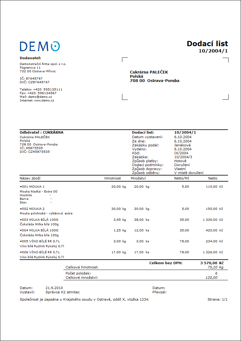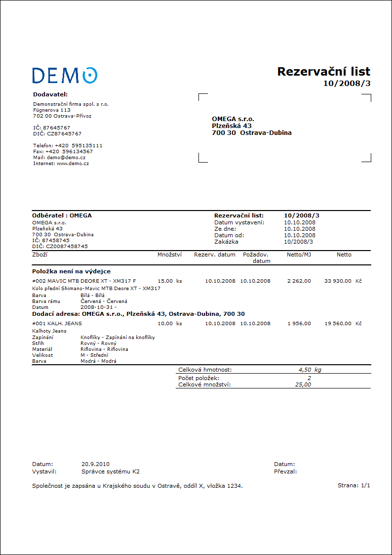 Weight - Ne Ano - zobrazí hmotnost jednotlivých položek a celkovou hmotnost "dokladu". |