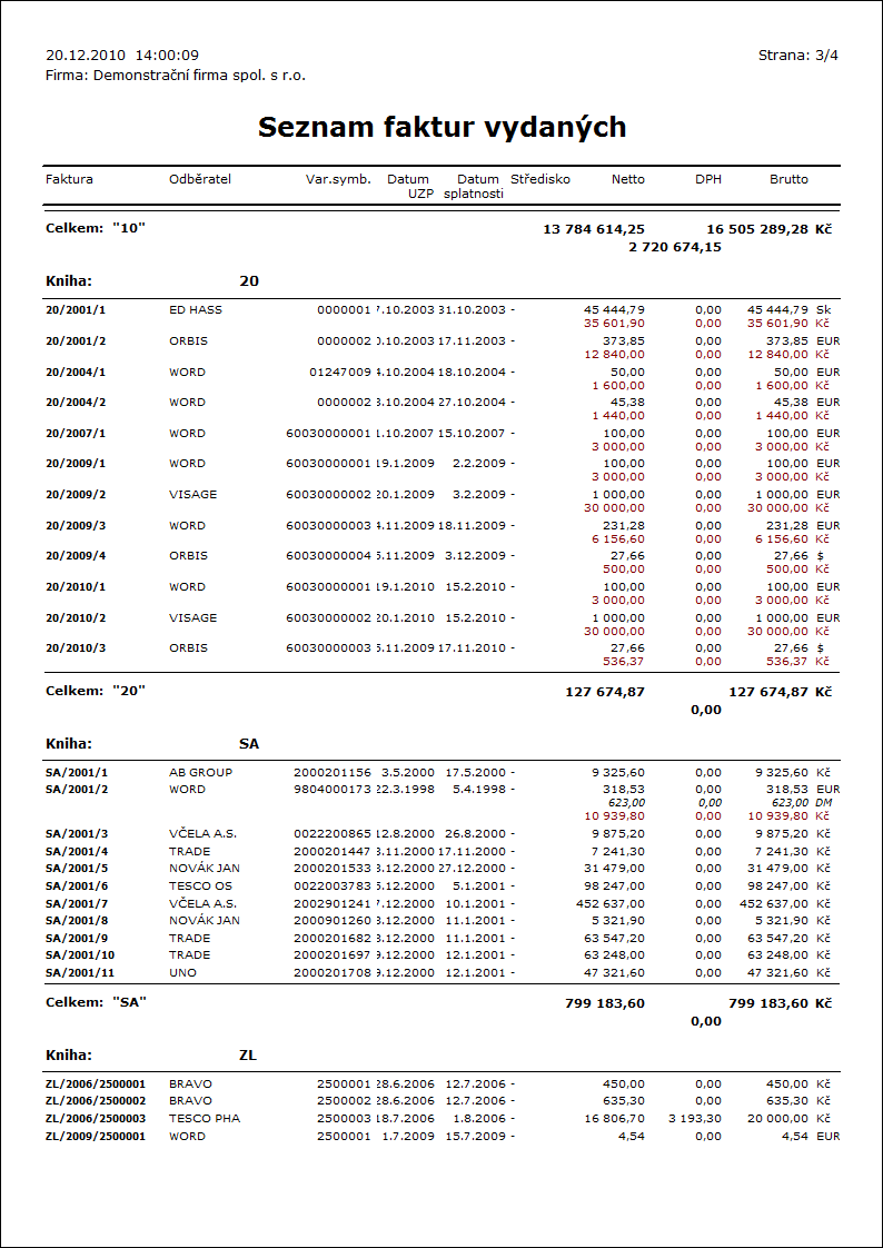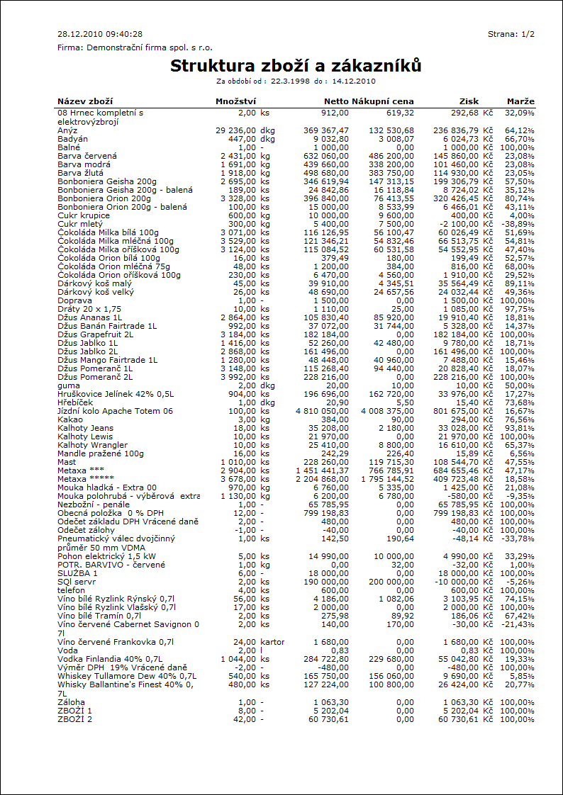 Popis sestavy: Přehled zboží prodaného zákazníkům. Sestava se spouští nad knihou Faktury vydané. V detailu každé karty zboží lze zobrazit rozpad po zákaznících a cenových kategoriích, a následně dále ještě rozpad na jednotlivé dny prodeje. Rozhodujícím datem je Datum účetního případu faktury. Zobrazovanými údaji jsou prodejní cena, nákupní cena, zisk a marže. |