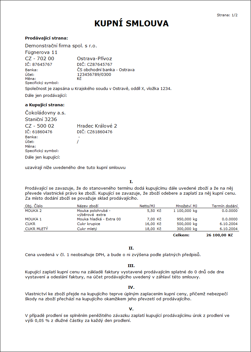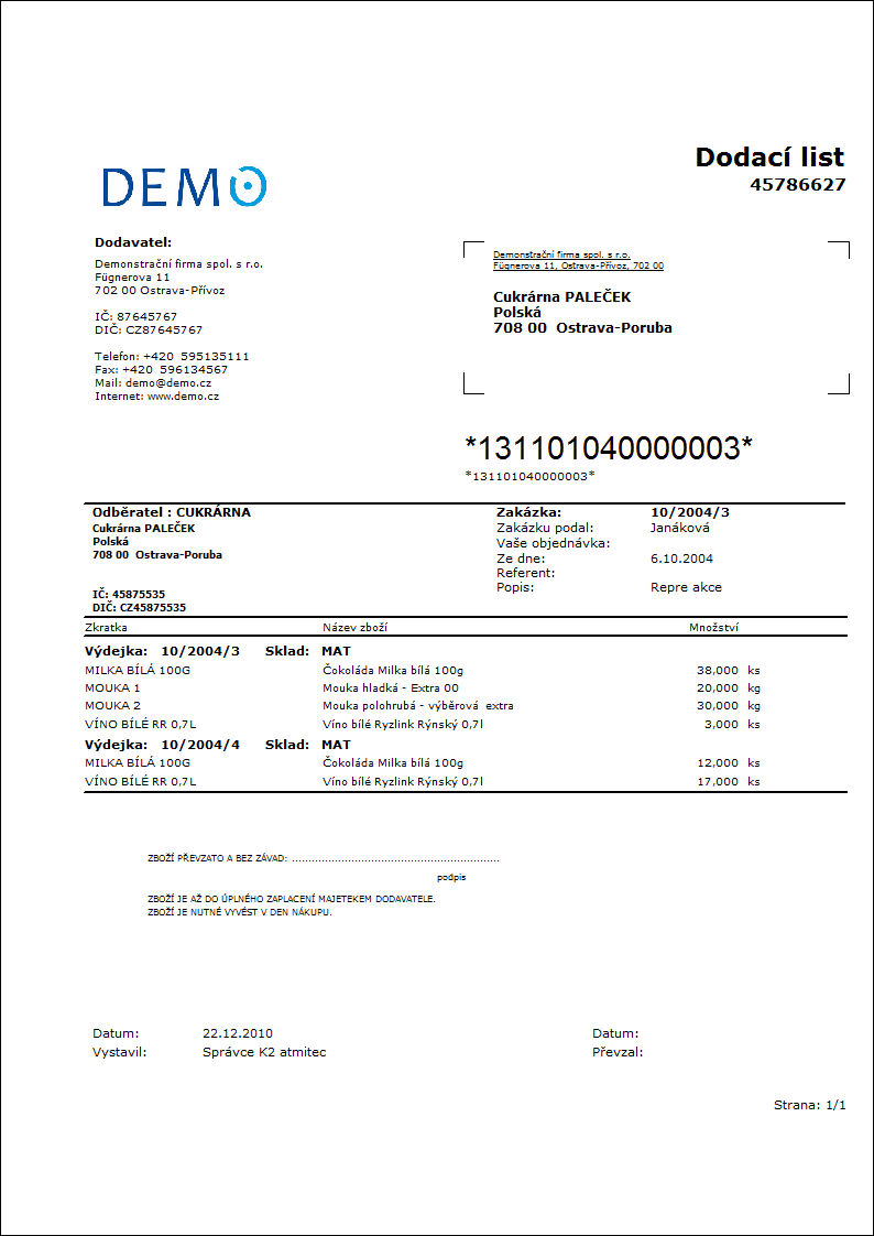 Contacts - 1;Addr;TaxNum;Tel1;Fax1;Email1;WWW Parametr má celkem 10 pozic, pevně stanovené jsou první tři: 1. pozice: uživatel, jehož kontakty z karty uživatele (telefon, mobil, fax, email) se tisknou. Možnosti: 0 - žádné uživatelské kontakty, 1 - uživatel, který doklad vystavil, 2 - aktuálně přihlášený uživatel - který doklad tiskne. 2. pozice: "Addr" - je-li zadáno, pak se zobrazí adresa firmy. 3. pozice: "TaxNum" - je-li zadáno, pak se zobrazí IČO a DIČ. 4. - 10. pozice: vyjmenované typy elektronických adres vlastní firmy (tzn. může jich být až 7). Příklad: (Contacts - 1;Addr;;TEL1;FAX1;WWW1): Zobrazí se Adresa firmy, pod ní kontakty z karty uživatele, který doklad vystavil, (daňová čísla jsou vynechána prázdným stringem 3. pozici) následují elektronické adresy s typem Tel1, Fax1, WWW1. Pozn.: Je-li některý z údajů potlačen, nezůstává volné místo. Nicméně Výchozí pořadí v sestavě je vždy: adresa, daňová čísla, kontakty uživatele, zadané elektronické adresy vlastní firmy. |