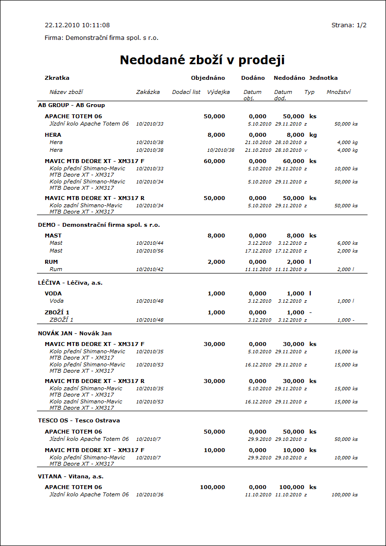 Popis sestavy: Zakázka odběratele. |