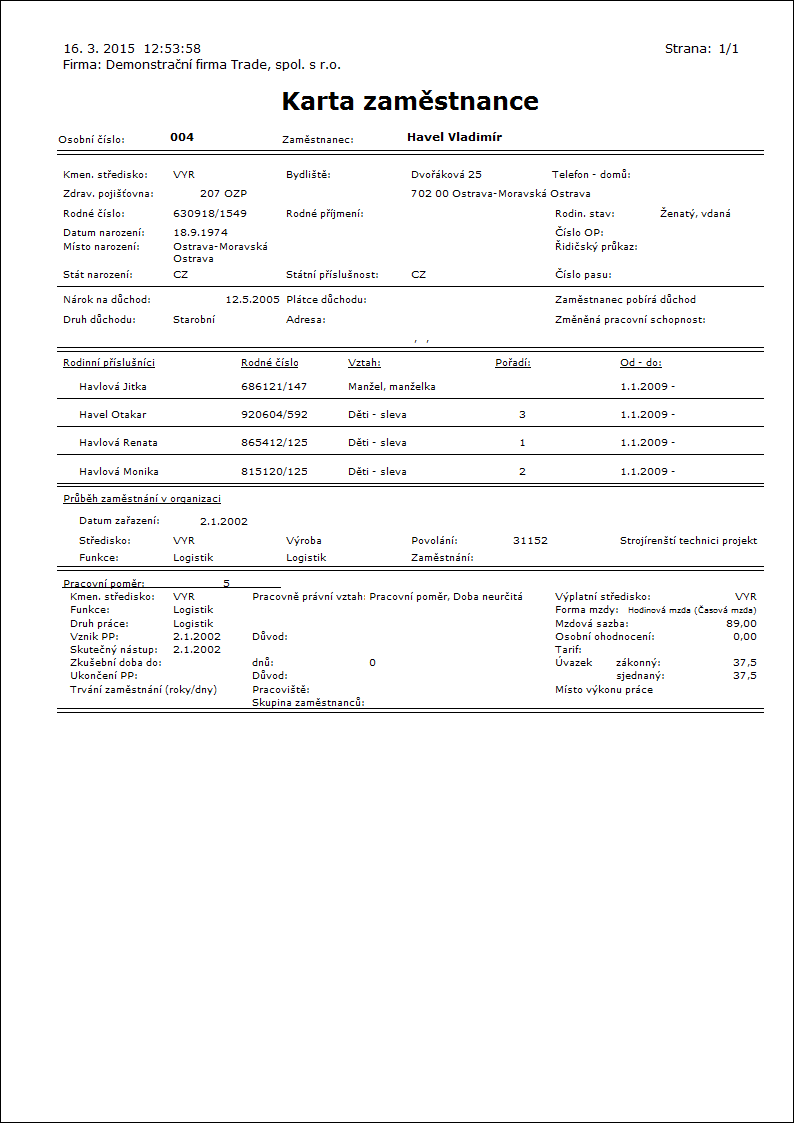 Popis sestavy: Seznam zaměstnanců s rodným číslem, datem a místem narození. |