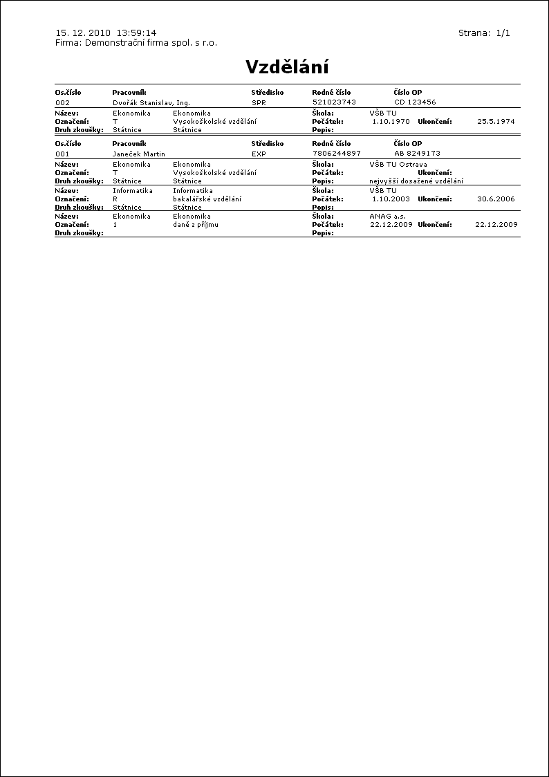 Popis sestavy: Přehled kvalifikací jednotlivých zaměstnanců. |
