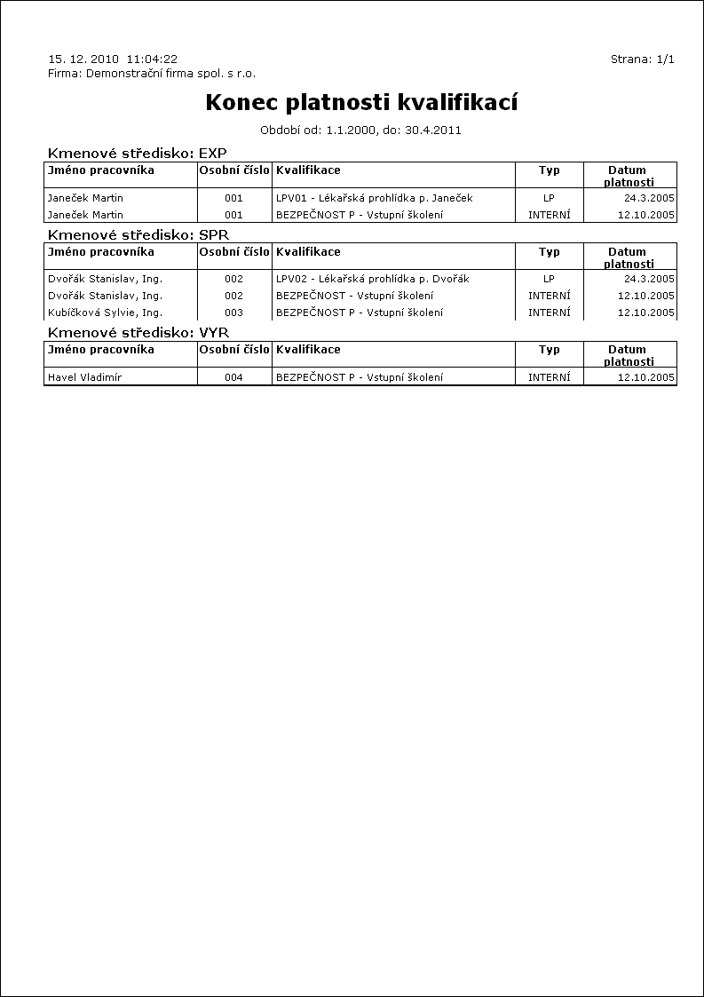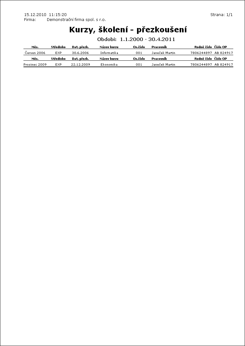Popis sestavy: Výpis kurzů a školení podle data přezkoušení. Po spuštění balíčku je možno vybrat interval od - do. |