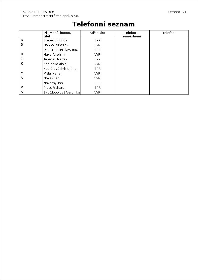 Popis sestavy: Telefonní seznam zaměstnanců. |