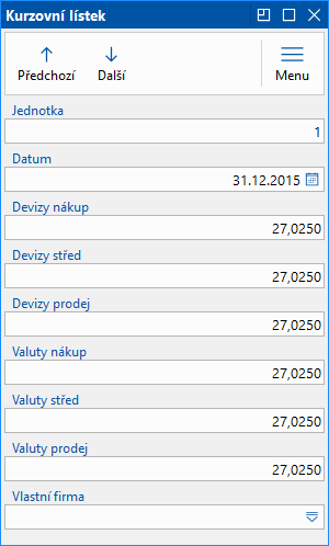 - pro ostatní vlastní firmy bude v položkách kurzovního lístku k datu pole Firma prázdné.