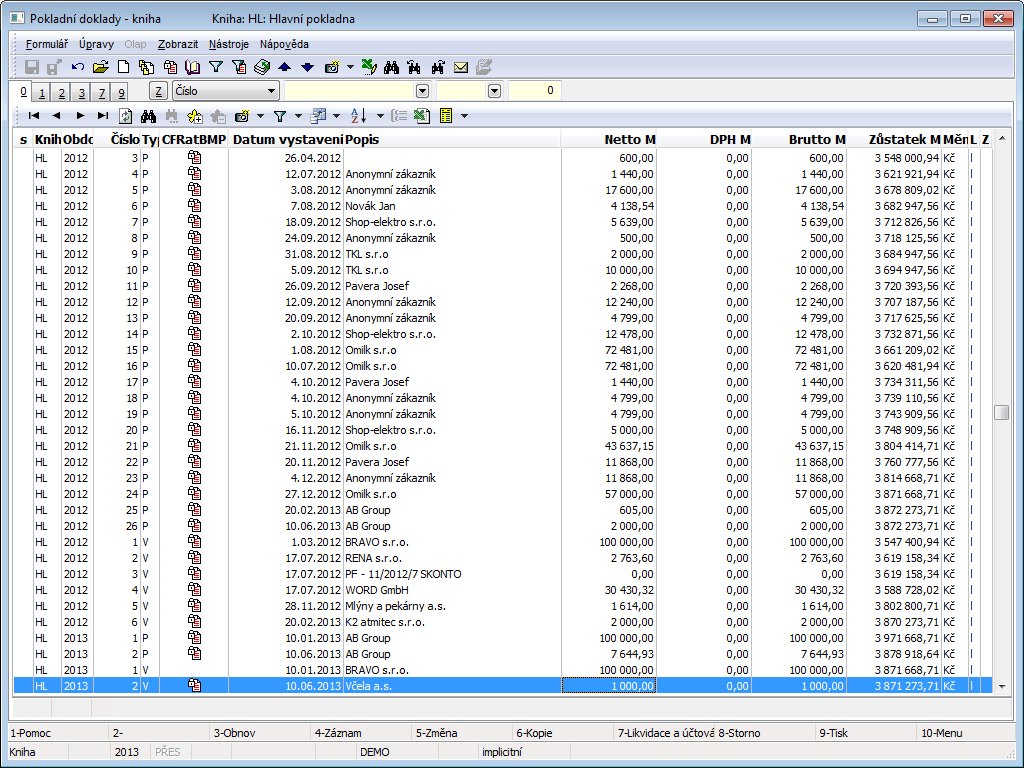 The bank statement number including the book of cash. It is filled automatically after pressing Insert key. |