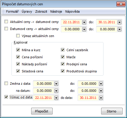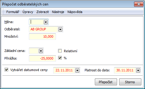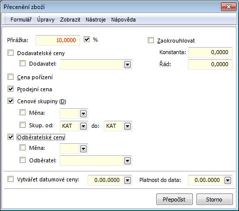 By means of the recalculation, the stock price is updated according to the last, a current, a sliding, a purchase price, a price of an optimal supplier or a net price of an optimal supplier, some of which of these values are displayed in the fields on the 2nd page of an Article card. The detailed description of this function is stated in the Basic manual in theForm - Actions - Articles chapter.