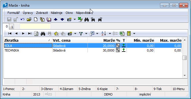 The margin can be entered either in absolute terms or as a percentage. Insert a new margin into the price list via the Ins key or the F6 key.