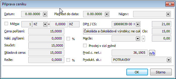 Multiplier is a figure that provides the option to take various variances of supplier prices into consideration (discounts,... - multiplier <1; transport, surcharges >1 etc.). You may assign 4 factors to each Product Group, which will further project into the net purchasing price of articles via multiplying all coefficients and the entered price. For instance, if we select one multiplier =0,5 and we do not enter the others, then after entering the price of 100 CZK the final net price will be equal to 100 x 0,5 = 50 CZK.