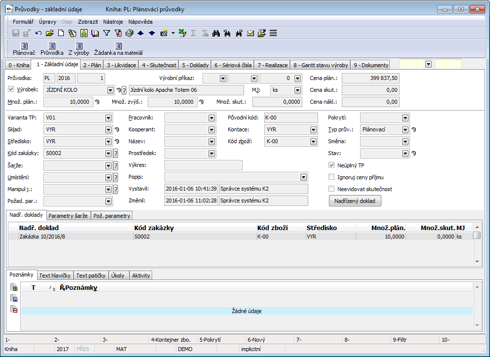 Job card is a document that allows to plan the production of a certain product and then realize this production. It allows to monitor fulfillment of material standards, outputs standards and planned deadlines. The job card dispenses the inputs from production warehouses and receives products to production warehouses. The job card enters into the accounting. We distinguish 4 basic types of job cards - planning, completion, normal and correction job card.