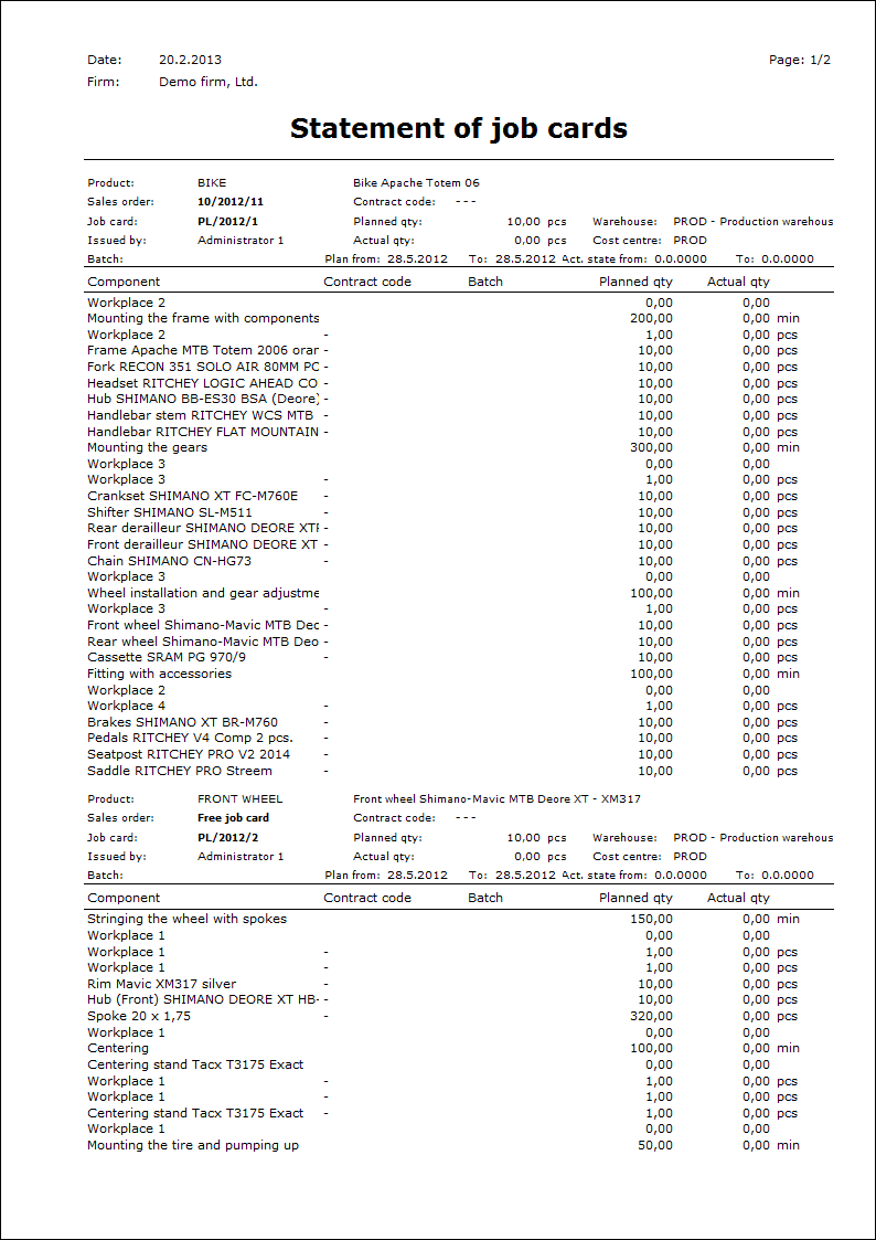 The Planning job card is a document that is used to plan the production process. The planned quantity is copied to the document from the routing and can be changed, the actual quantity is loaded from the Completion job cards. The production is not realized by confirming a planning job card - i.e.. neither release of materials, nor receipt of a semi-product or a product to a warehouse is not executed. Planning job card is a prescription for Completion job cards.