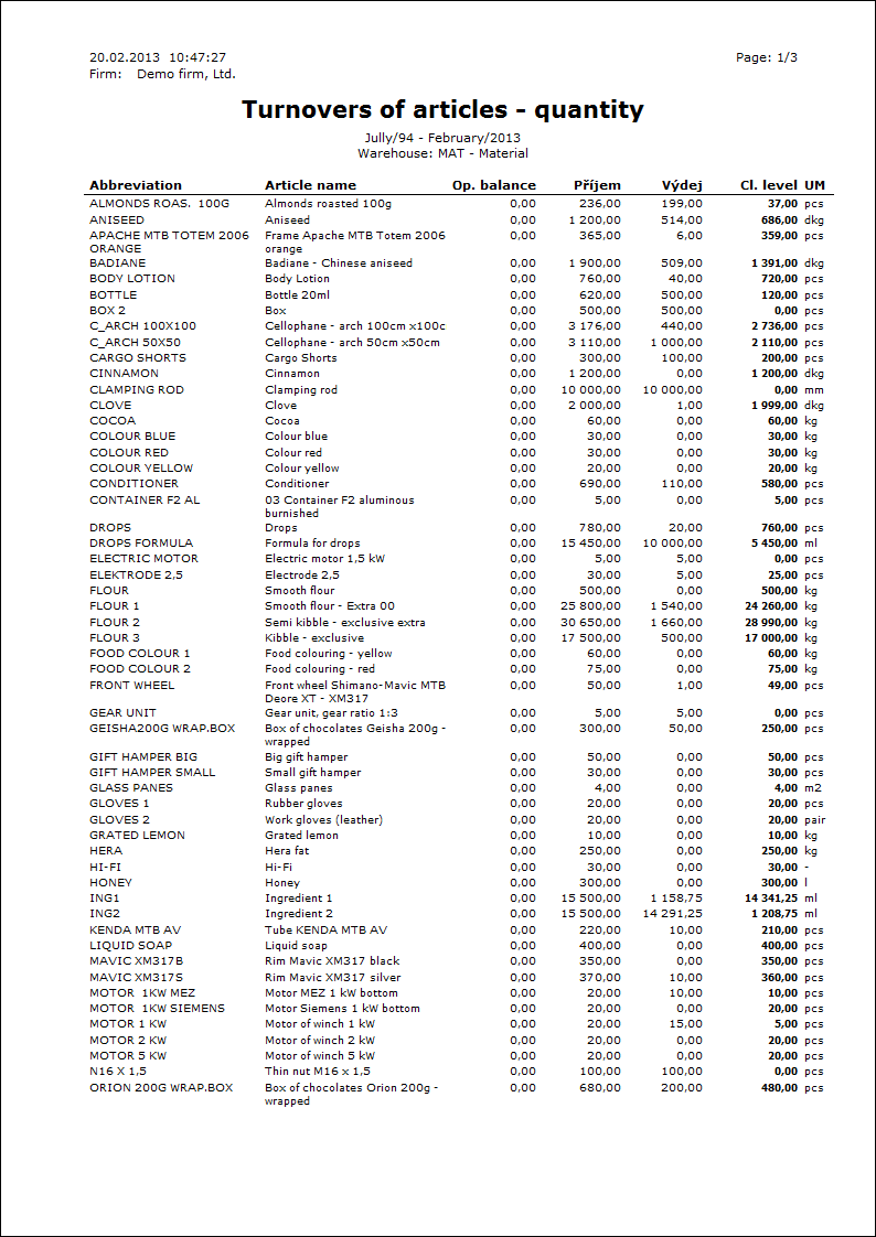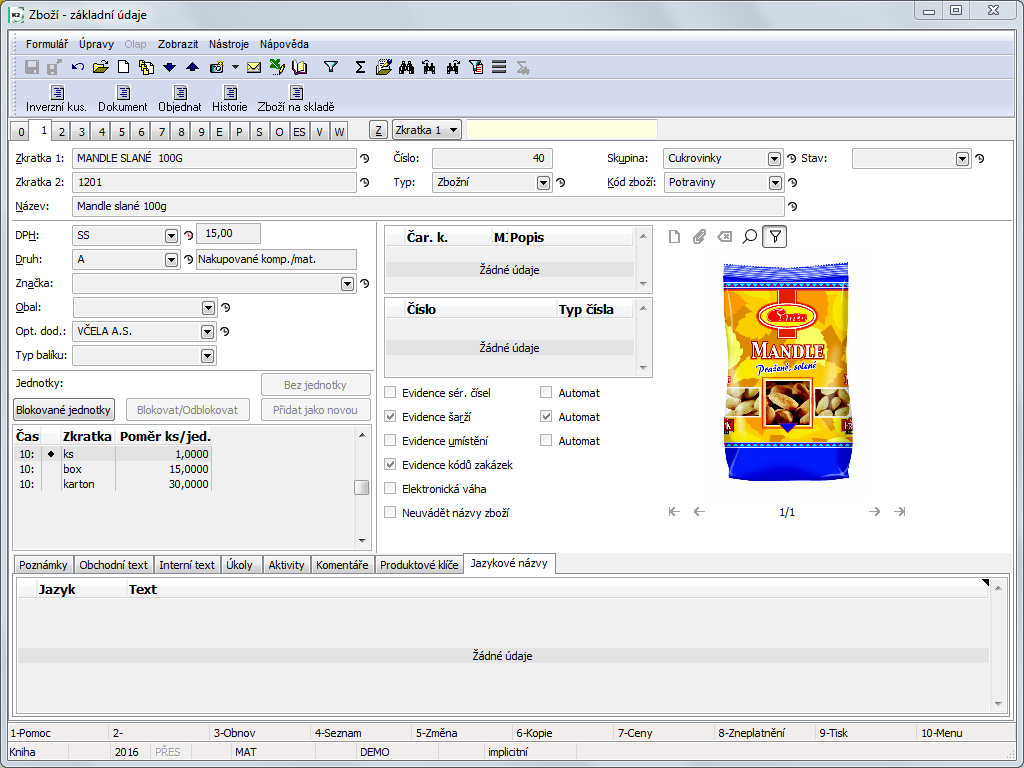Article code is a random number or text which every article has to have assigned. Even in This case, can be in This field dash entered. According to the article code it is possible to divide goods for example to inland software or foreign software, alcohol to beer, wine, spirits,plain bearings for split and undivided, etc. Article code can enter to accounting as a complementary (helping) analytics of appropriate accounts. |
