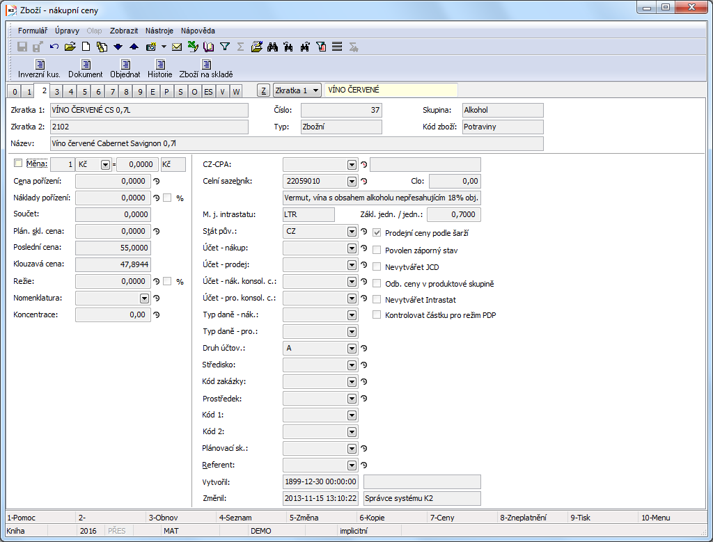 Each article has its internal number that is automatically assigned by system (after saving by pressing F2 key) and that serves to an unique identification of articles in K2 IS.