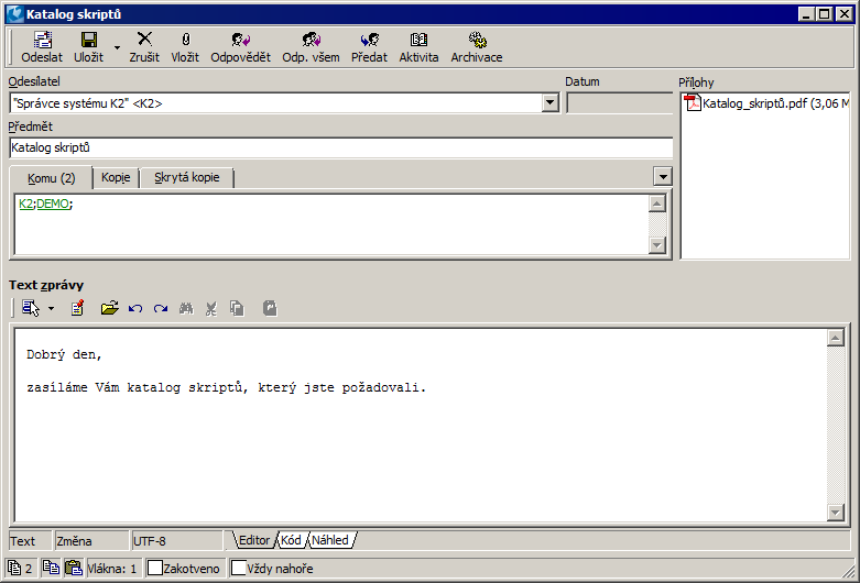 Press the Send button to send the message. The message is sent as a copy to every entered recipient (including the attachments) and it is saved into his/her Inbox folder. The original message is moved into the Outbox folder of the user.