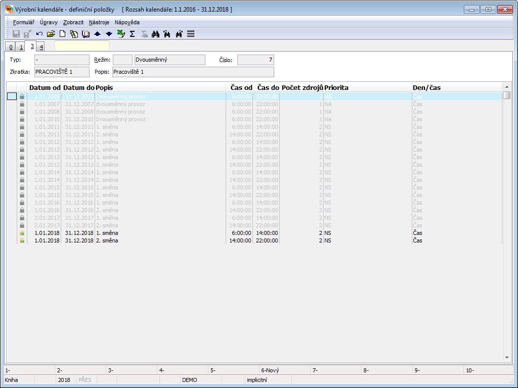 After running this function, the Production Calendars book is called up, in which we define calendars for production resources. Range of calendars is set by Alt+F10 keys.