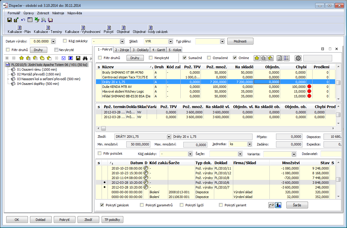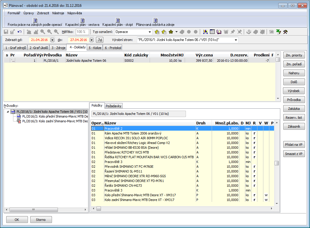 The chart shows the individual job cards in the time. The vertical axis is divided according to the individual root job cards (one root job card can have several inferior job cards), the horizontal axis shows the time series. One abscissa of the chart represents one job card. The length of the abscissa means the time that all operations last, that means how many minutes it is necessary for executing all the operations stated in the routing of a job card. Job cards connected by the thin line are linked through the superior documents and form the tree of job cards together (production tree).
