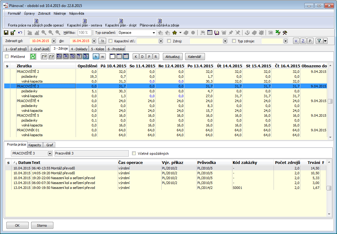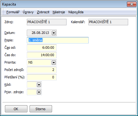 The calendar of the currently marked resource is described here. Particular data of calendar items can be changed by editing values in columns, eventually you can call up the Capacity form by the Ctrl+Shift+Enter keys combination.