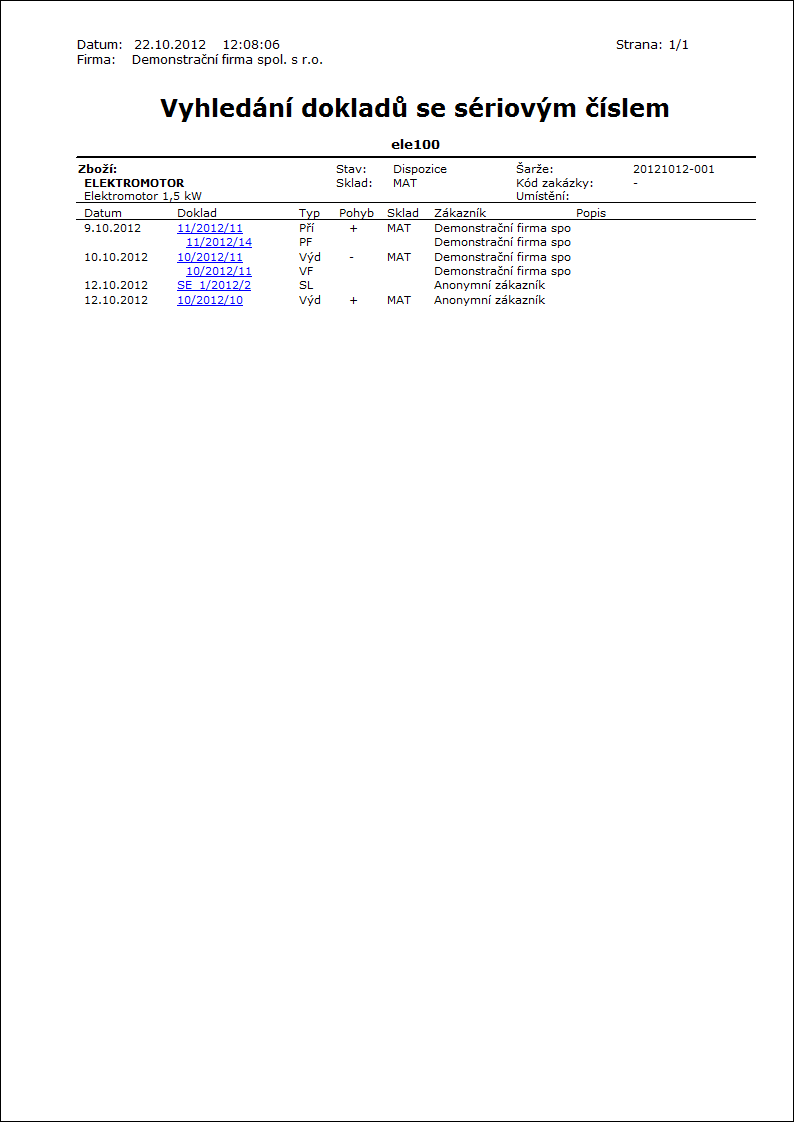 Popis sestavy: Zobrazí seznam dokladů, na kterých se vyskytuje zboží se zadaným sériovým číslem. Pokud je sestava spuštěna nad konkrétním sériovým číslem (6. strana dokladu, nad formulářem Sériová čísla na skladě, nad záložkou Sériová čísla na 1. straně servisního listu), pak se do vstupního formuláře předvyplní označené sériové číslo automaticky. V hlavičce záznamu zobrazí aktuální informace o stavu sériového čísla (status a celou kombinaci pomocné skladové evidence). |