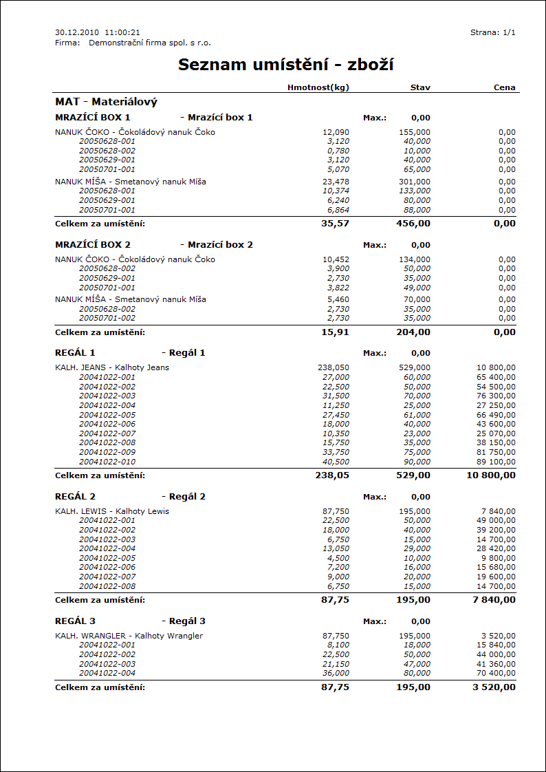 Popis sestavy: Sestava umožní vytisknout skladovou kartu za jednotlivá (nebo za všechna) umístění. |