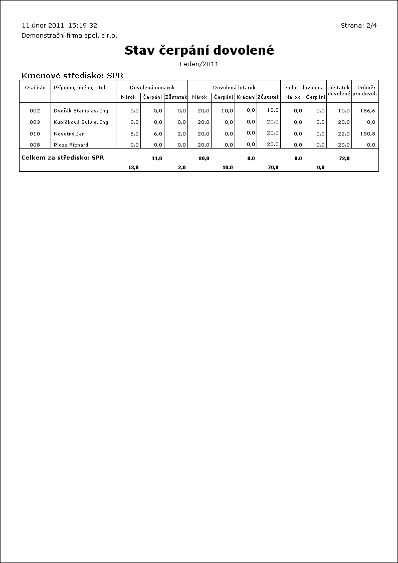 Popis sestavy: Přehled o čerpání dovolené v nastaveném měsíci. |