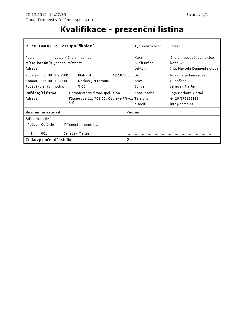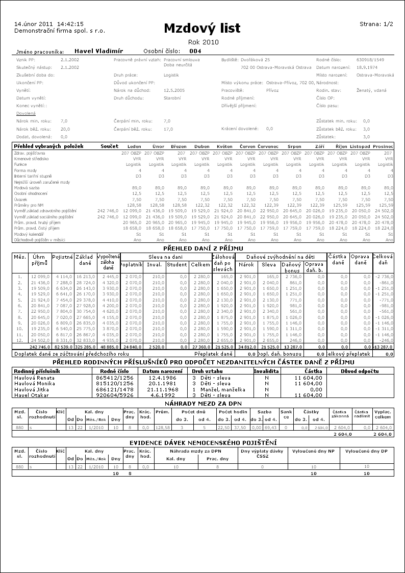 Popis sestavy: Pracovní list zaměstnance tištěný na výšku. Zaměstnancům jde zaslat emailem podobně jako Výplatní lístek. Emailová adresa pro zasílání se bere z personální karty, pokud je propojena s kontaktní osobou, pokud není, pak se vezme z pole EMAIL na kontaktní osobě. Pro zaměstance je možné jej zaheslovat.