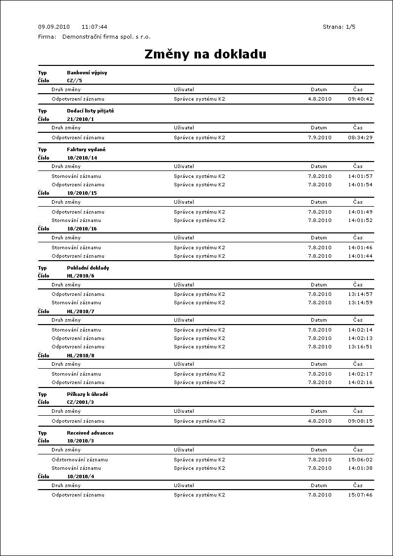 NoGroup - 0 0 - pořadí; 1 - firma; 2 - uživatel; 3 - typ dokladu; 4 - datum; 5 - typ změny. |