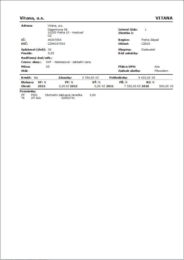 Popis zostavy: Zostava vytlačí kartu zákazníka vrátane obratov za aktuálny rok, vrátane 3 predchádzajúcich rokov, a pokiaľ je ku karte pripojený Partner, tak aj údaje z Partnera, prípadne z Aktivít. Zobrazovanie Partnera a Aktivít je možné obmedziť parametrom. |