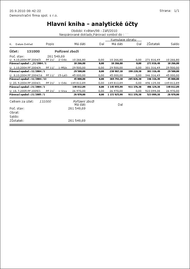 Pre výpis všetkých nespárovaných dokladov sa používa zostava Hlavná kniha - analytické účty podľa zotriedenia, ktorá sa spúšťa nad Hlavnou knihou. V Hlavnej knihe na záložke Pohyby vybraného účtu klávesovou skratkou Alt+F10 nastavíme príslušný interval periód, pre ktorý vykonávame kontrolu. Na zostave Hlavná kniha - analytické účty podľa zotriedenia nastavíme parametre Zotriedenie =1 a Len nespárované = „Áno“ a vytlačíme zostavu.