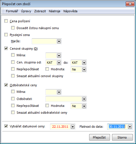 By means of the recalculation, the stock price is updated according to the last, a current, a sliding, a purchase price, a price of an optimal supplier or a net price of an optimal supplier, some of which of these values are displayed in the fields on the 2nd page of an Article card. The detailed description of this function is stated in the Basic manual in theForm - Actions - Articles chapter.