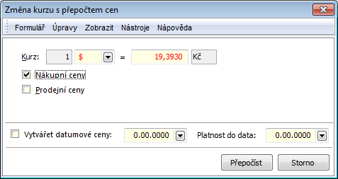 The supplier prices will not be completed into the Purchase Order, as the currency of the price is not identical with the currency of the document. In this case, the price defined in the Purchase Price field from the Article card (if set) will be completed into the Purchase Order. If we want the supplier prices to be completed also in the CZK currency, they must be defined in this currency.