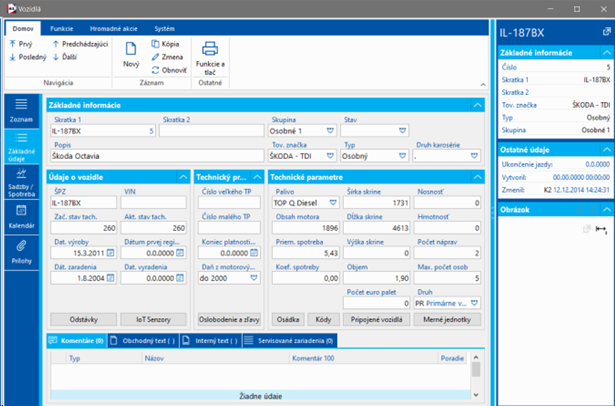 Na strane základné údaje karty Vozidla sa taktiež uvádzajú technické parametre vozidiel.
