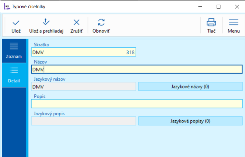 Typ komentára DMV je potrebné ručne vytvoriť pomocou klávesy Insert resp. F6 v číselníku typov komentárov.