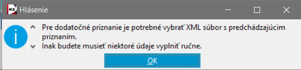 • Dodatočné daňové priznanie - možnosť výpočtu dodatočného daňového priznania ale aj načítania predchádzajúceho podaného daňového priznania z xml súboru, z ktorého je možné vytvoriť dodatočné daňové priznanie. Pre tento prípad je potrebné zaškrtnúť možnosť: Dodatočné daňové priznanie, po tejto akcii sa objaví hlásenie, po ktorého odsúhlasení je možné vloženie pôvodného daňového priznania, z ktorého sa následne prenesú údaje do dodatočného daňového priznania. Ak nie je vložené pôvodné daňové priznanie, nevyplnia sa údaje prenášané z pôvodného daňového priznania a tieto údaje bude potrebné vyplniť ručne.