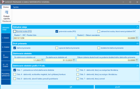 Priznanie k dani z motorových vozidiel - výpočet a export