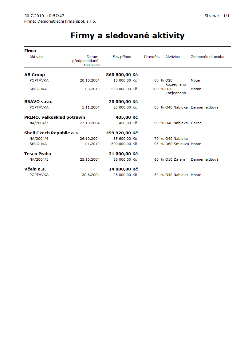 Popis sestavy: Tato sestava zobrazuje zkratku a popis dané kampaně. Dále jsou zde vidět aktivity příslušné kampaně seskupené podle partnera. Sestava obsahuje základní informace o aktivitách jako je Zkratka, Datum, Typ, Kontaktní osoba, Mobilní telefon a Telefon. Pomocí parametru lze zobrazit k jednotlivým aktivitám také jejich komentář.
