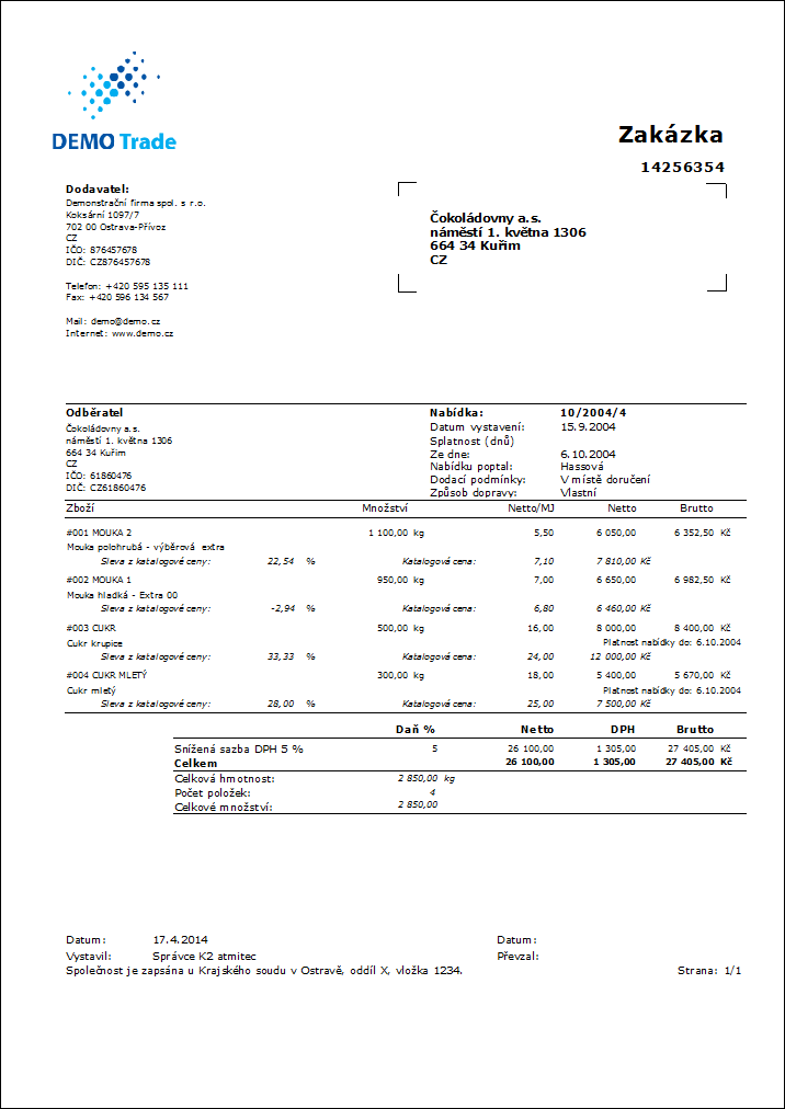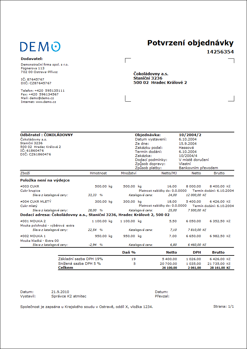 Contacts - 1;Addr;TaxNum;Tel1;Fax1;Email1;WWW Parametr má celkem 10 pozic, pevně stanovené jsou první tři: 1. pozice: uživatel, jehož kontakty z karty uživatele (telefon, mobil, fax, email) se tisknou. Možnosti: 0 - žádné uživatelské kontakty, 1 - uživatel, který doklad vystavil, 2 - aktuálně přihlášený uživatel - který doklad tiskne. 2. pozice: "Addr" - je-li zadáno, pak se zobrazí adresa firmy. 3. pozice: "TaxNum" - je-li zadáno, pak se zobrazí IČO a DIČ. 4. - 10. pozice: vyjmenované typy elektronických adres vlastní firmy (tzn. může jich být až 7). Příklad: (Contacts - 1;Addr;;TEL1;FAX1;WWW1): Zobrazí se Adresa firmy, pod ní kontakty z karty uživatele, který doklad vystavil, (daňová čísla jsou vynechána prázdným stringem 3. pozici) následují elektronické adresy s typem Tel1, Fax1, WWW1. Pozn.: Je-li některý z údajů potlačen, nezůstává volné místo. Nicméně Výchozí pořadí v sestavě je vždy: adresa, daňová čísla, kontakty uživatele, zadané elektronické adresy vlastní firmy. |