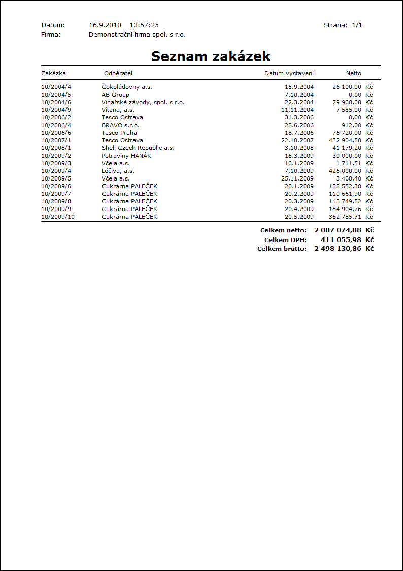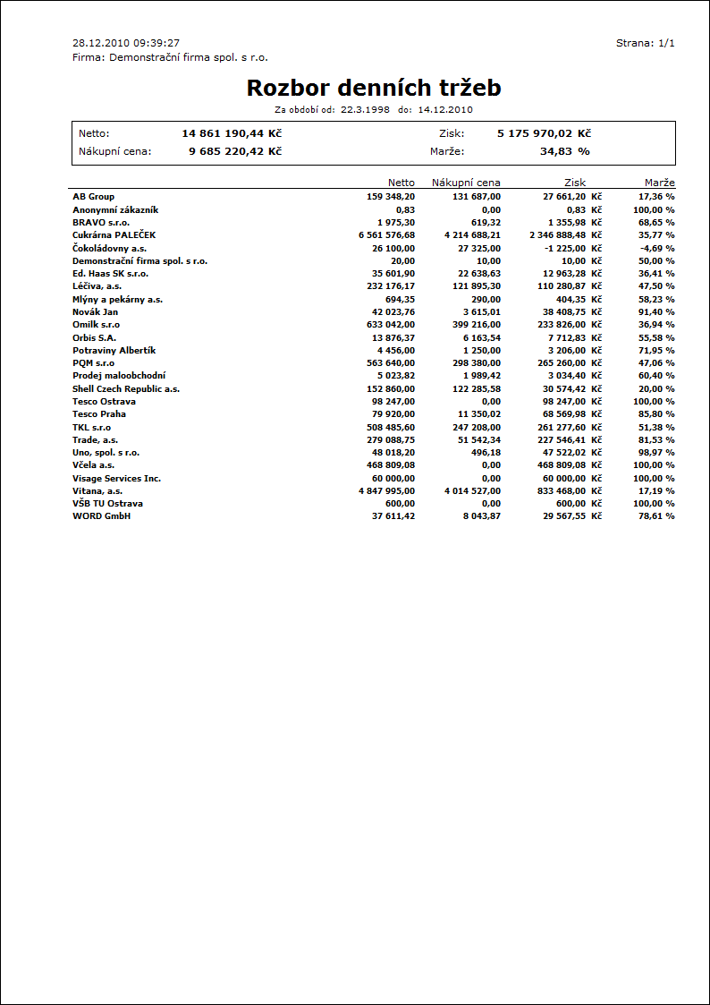 Popis sestavy: Přehled denních tržeb - podle zákazníků (po vybrání nabídky zákazníka). |