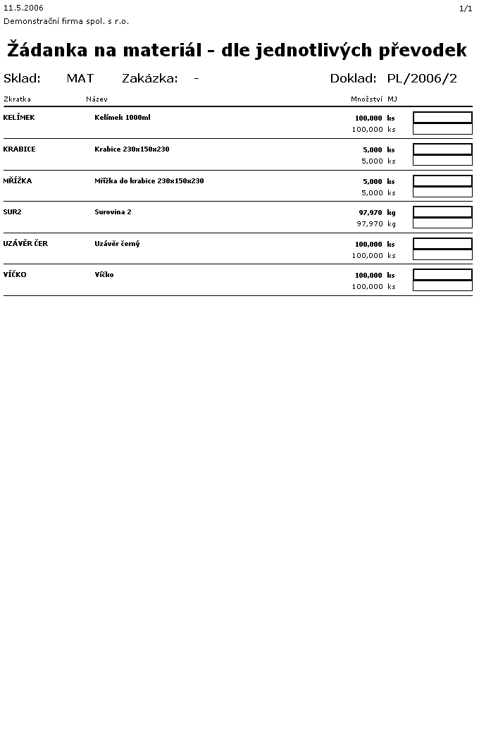 Popis sestavy: Výroba - žádanka na materiál. Spustitelné ze skriptu VYR_ZADMAT.PAS (Žádanka na materiál). Bližší popis skriptu a sestavy viz Metodika_Zadanka na material.pdf.