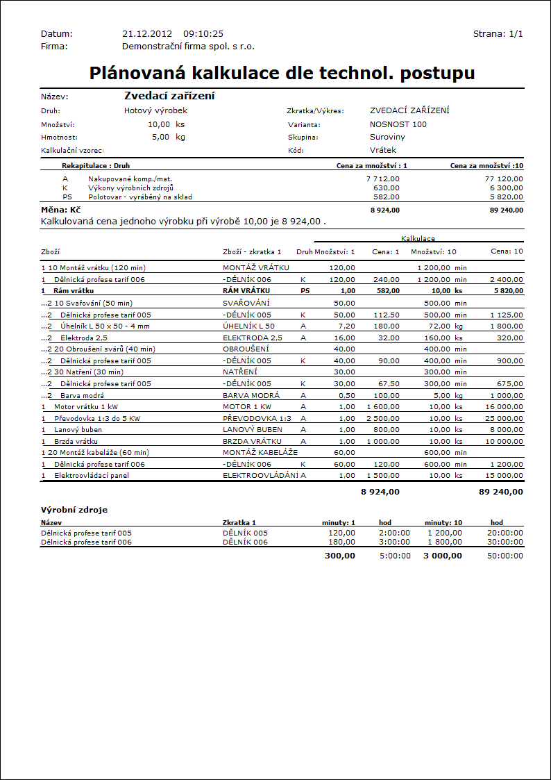 Popis sestavy: Sestava se spouští pouze nad Dispečerem (nutno zařadit na lištu). Zobrazí strom položek z jednotlivých průvodek, plánované a skutečné množství a cenu. Cena výrobků nebo polotovarů je napočtena z položek technologického postupu. Zobrazené položky odpovídají filtru druhů na Dispečerovi.