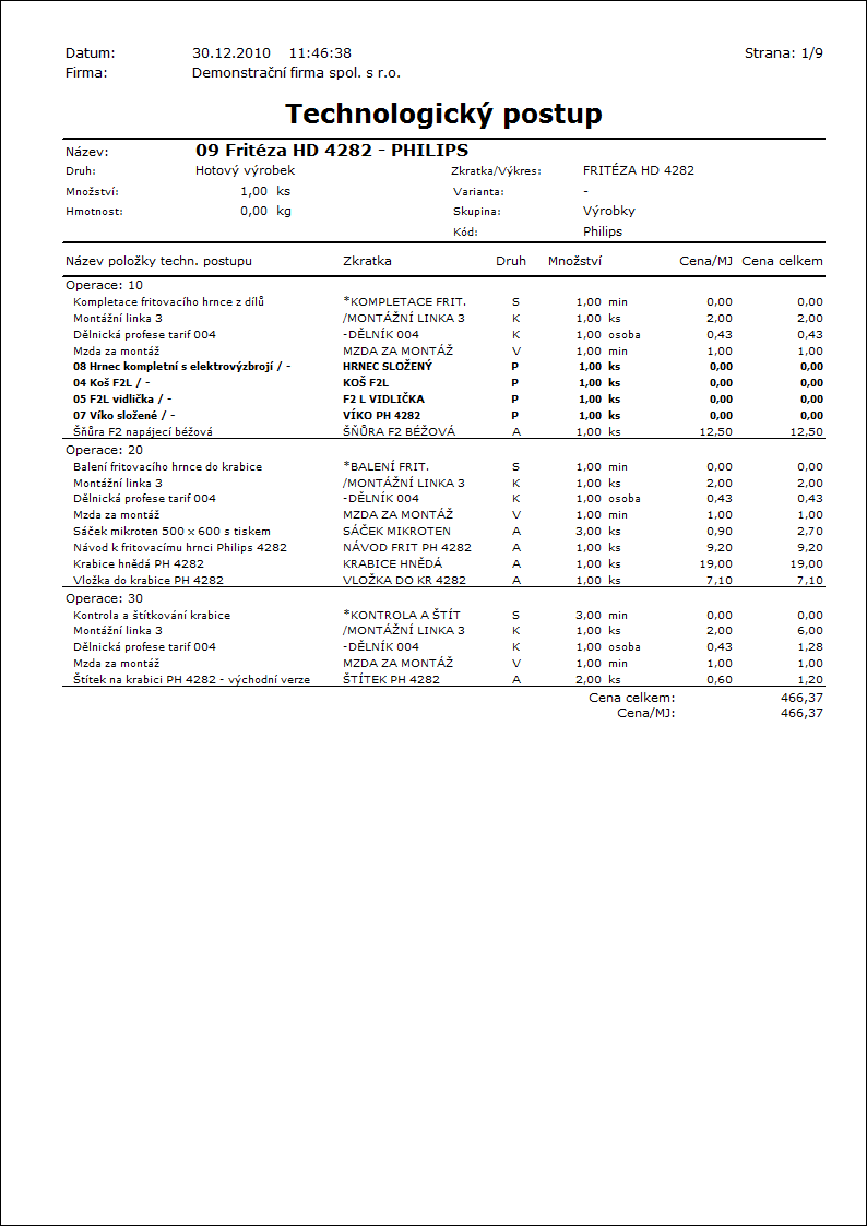 Popis sestavy: Sestava zobrazuje operace výrobních stromů a jejich časy. Lze také zobrazit rozpad časů po jednotlivých zdrojích.