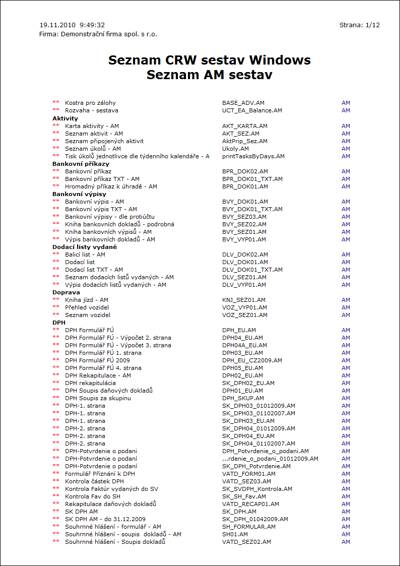Popis sestavy: Seznam standardních a speciálních tiskových sestav. Implicitní nastavení - tiskne vše.