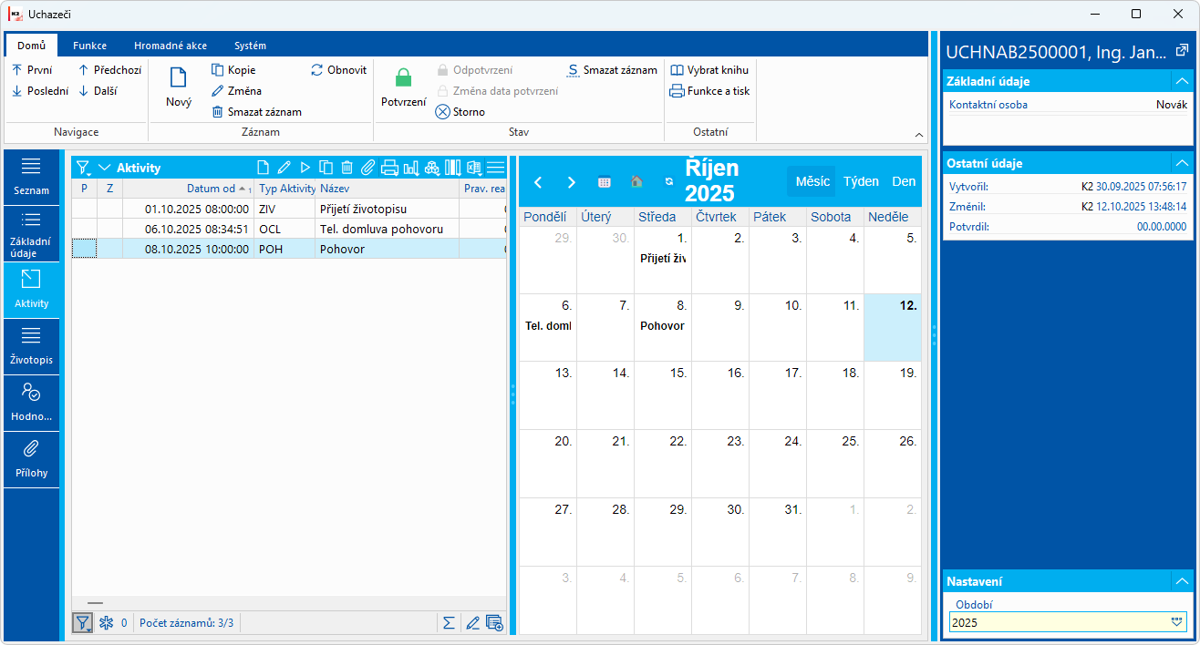 Na záložce Aktivity je možné evidovat jednotlivé kroky komunikace s uchazečem pomocí aktivit. Od přijetí životopisu, případného telefonického kontaktu či pohovoru s uchazečem.
