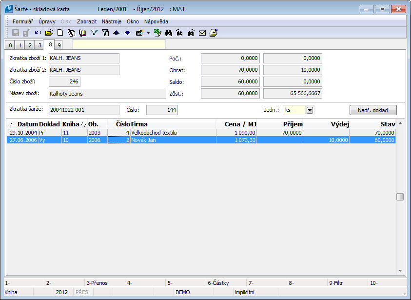 This page provides an overview of the stock movements of the batch for the selected period and stock. The controls and functions are identical to the article stock card, the description is given in the chapter Basic code lists and support modules K2 / Articles / Article card / Stock card.