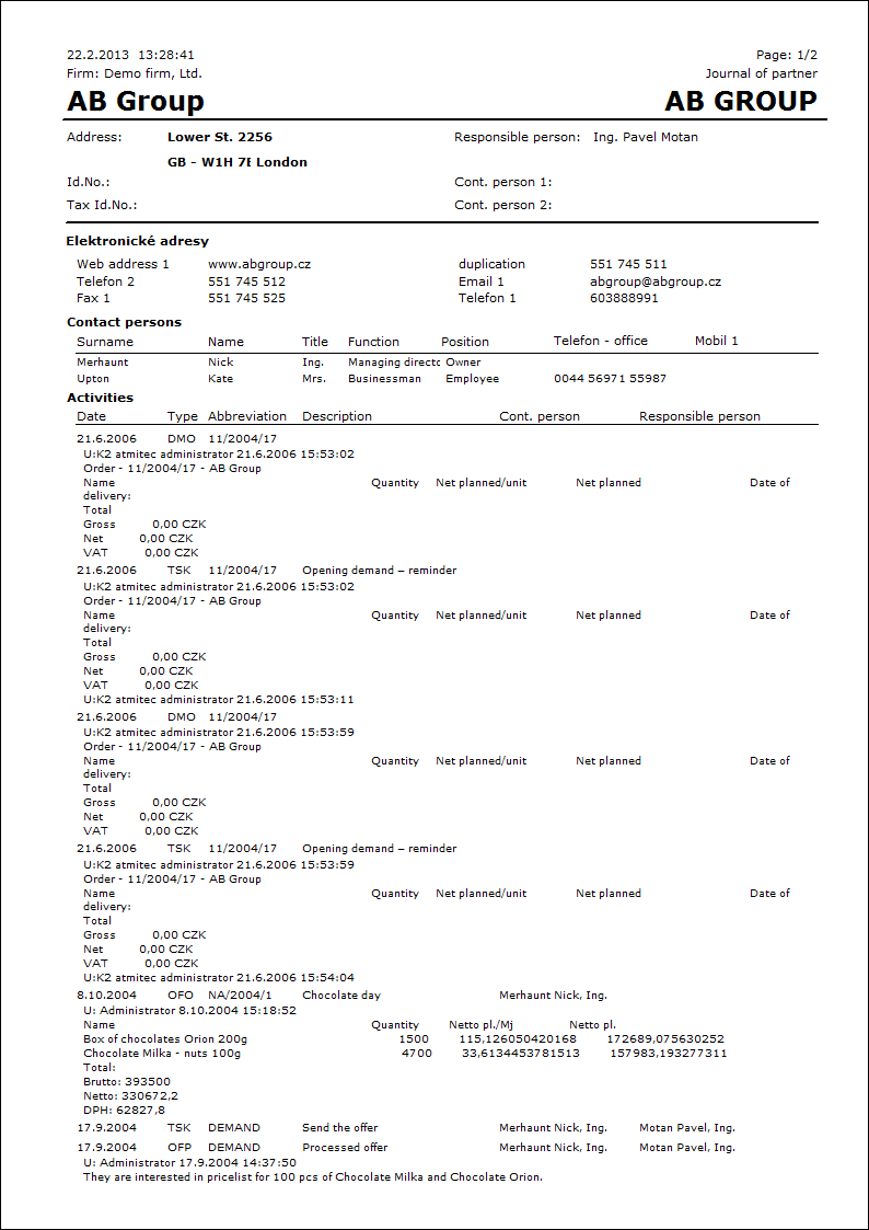 Report description: Journal of partner displays the basic information about partner and his/her contact persons. The list of activities of this partner including comments of these activities is stated in this report too. It is possible to influence the display of comments by a report's parameter. It is possible to set the way of sorting of activities according to the date, type, contact person or responsible person in the initial form. |