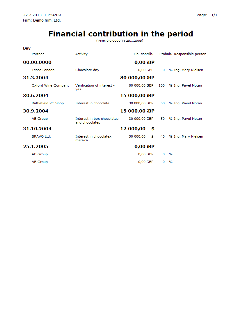 Report description: The report displays group of activities of partners sorted by probability of execution. Also the responsible person of partner is displayed in the report. It is possible to limit the quantity of printed records by the "Percentage of prob. of execution " parameter. It is possible to set here the value of probability of execution when the activity is displayed in the report. |