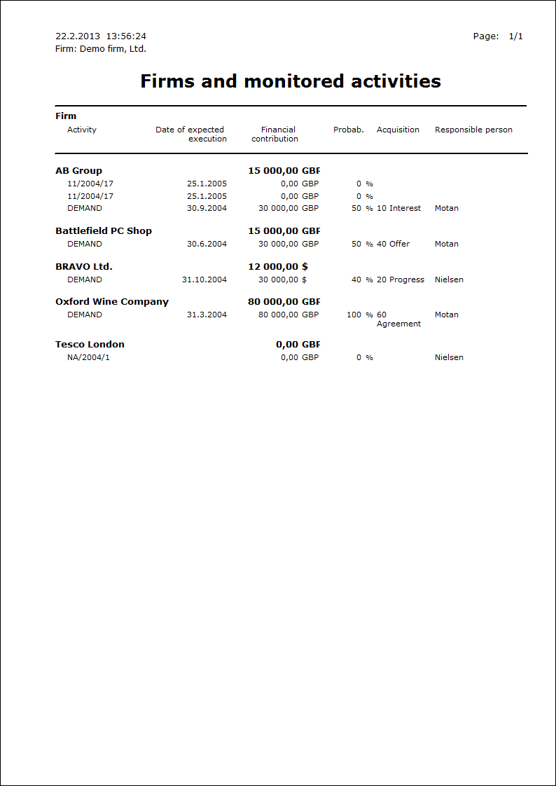 Report description: The report displays monitored activities of firms with description of an activity and its comment. It is possible to hide the comment of activity by a report's parameter. Every firm is printed on a new page in this report. |