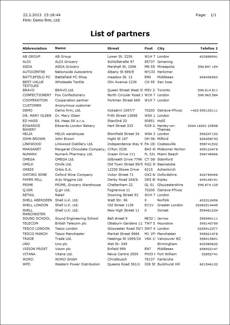 The partner is not always the customer automatically. A new partner becomes the customer after the business documents issue. It is obligatory to create the partners to the customers. The valuable marketing information are available for the user. The Partners database is very important with respect to monitor and to register all communication with a customer (partner). This is executed by means of Activities, the list of these activities is on the 2nd page of the Partner card. Further here are mentioned contact persons of partner, various sorting or tasks that are related to a concrete partner. It is possible to evaluate all these information and activities by means of reports that are available here.