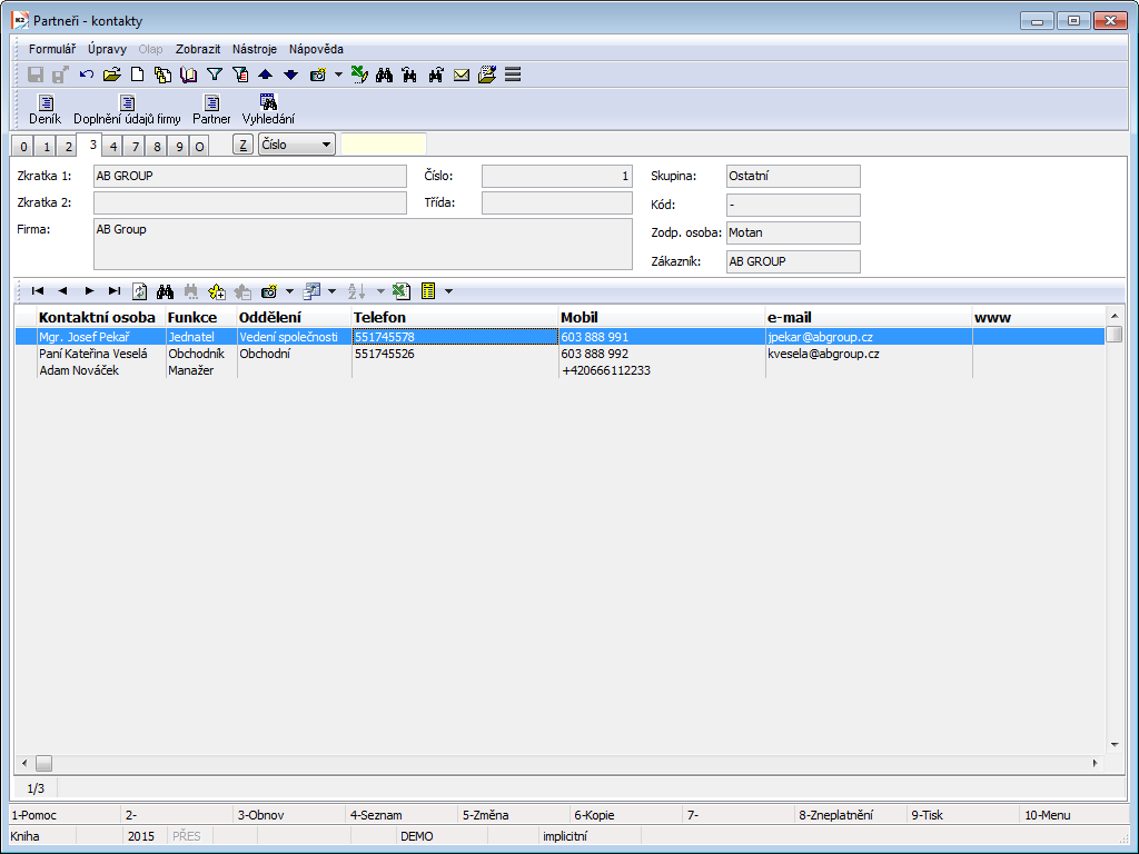 Report description: It deals with the list of contact persons for individual partners with the basic contact information (mobile phone, email, position, function, name). |